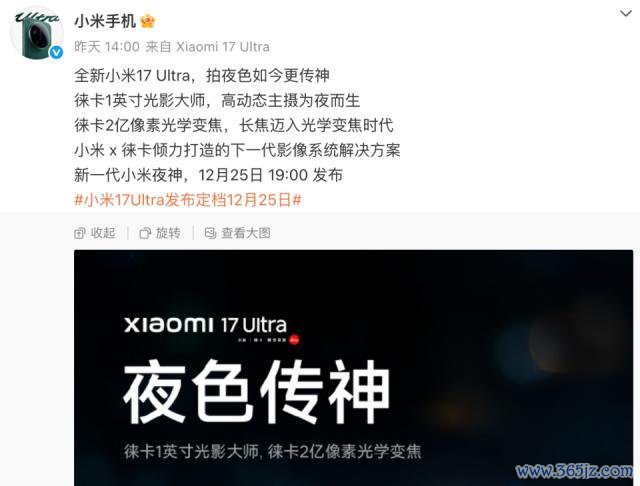凭证官方微博,小米 17 Ultra 将搭载全新光影猎东谈主 1050L 镜头,规格依旧是 1 英寸。