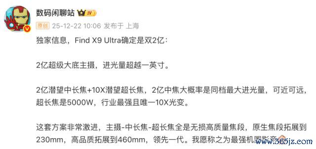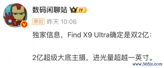 除了 10 倍超长焦,爆料闪现 Find X9 Ultra 还将搭载一颗 2 亿像素、1/1.3 英寸的 3 倍长焦。